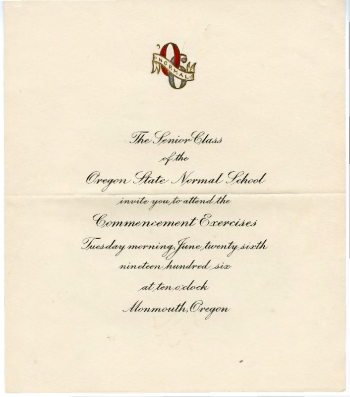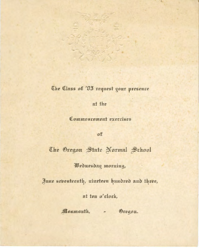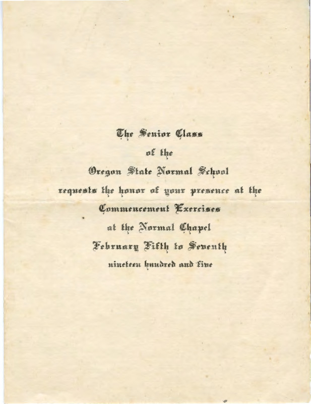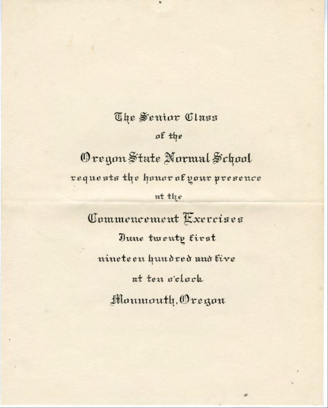 The Class of 1901 request the pleasure of your company at the Commencement Exercises of the [Oregon] State Normal School on Monday, February the fourth, at eight o'clock. Monmouth, Oregon.