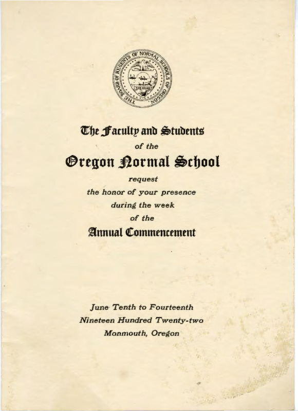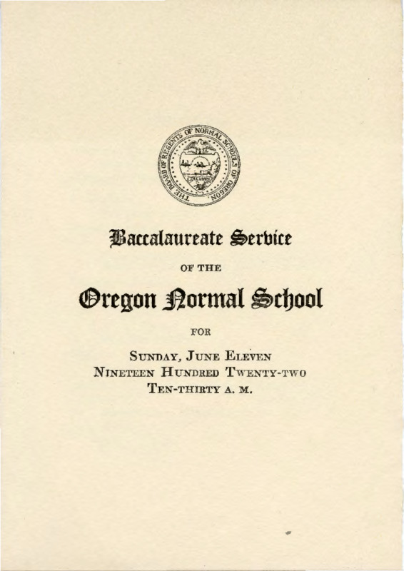 Baccalaureate Service of the Oregon Normal School for Sunday, June Eleven Nineteen Hundred Twenty-Two