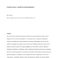Graciela Zozaya, an interpreter educator in Houston, Texas, personifies the evolution from a bilingual ad hoc translator and interpreter to a strong advocate for interpreter training and certification. Having more than four decades of experience in the industry, she has used her positions as manager for language services in the county’s flagship healthcare provider and as strategic solutions executive for a Large Language Services Provider to promote interpreter training and certification. Furthermore, she has collaborated with local universities in continuing education certificate programs for interpreters and translators. Her beliefs and compromise in the professionalization of interpreters is also exemplified by her key leadership roles in several organizations, including the National Council on Interpreting in Health Care and the National Board of Certification for Medical Interpreters, among others. Ms. Zozaya contributes her enthusiasm and commitment to professionalization to her friend and mentor Esther Diaz, a pioneer in establishing interpreter certification education programs in Texas.