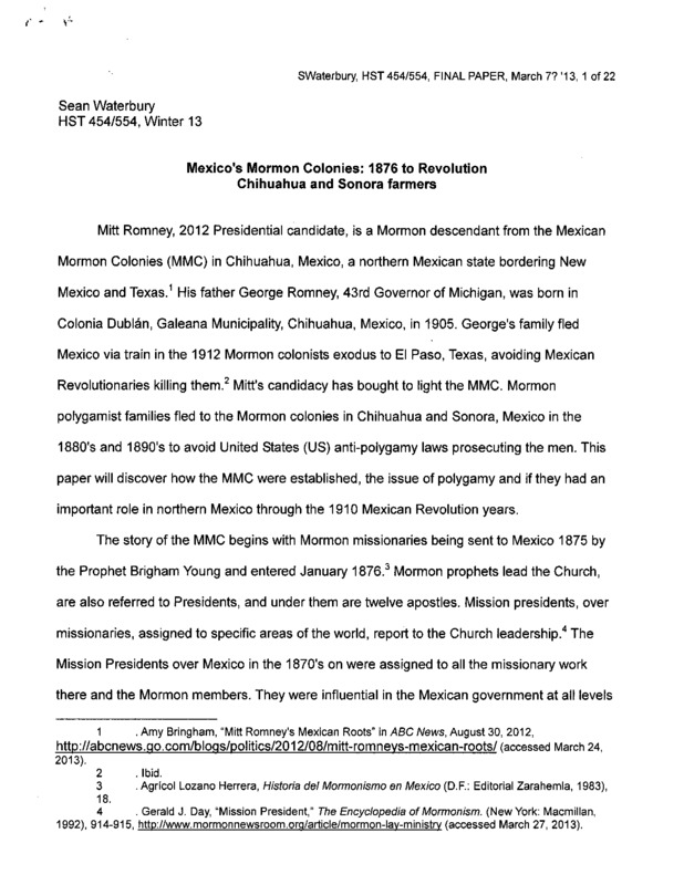 Mexico's Mormon Colonies: 1876 to Revolution Chihuahua and Sonora Farmers