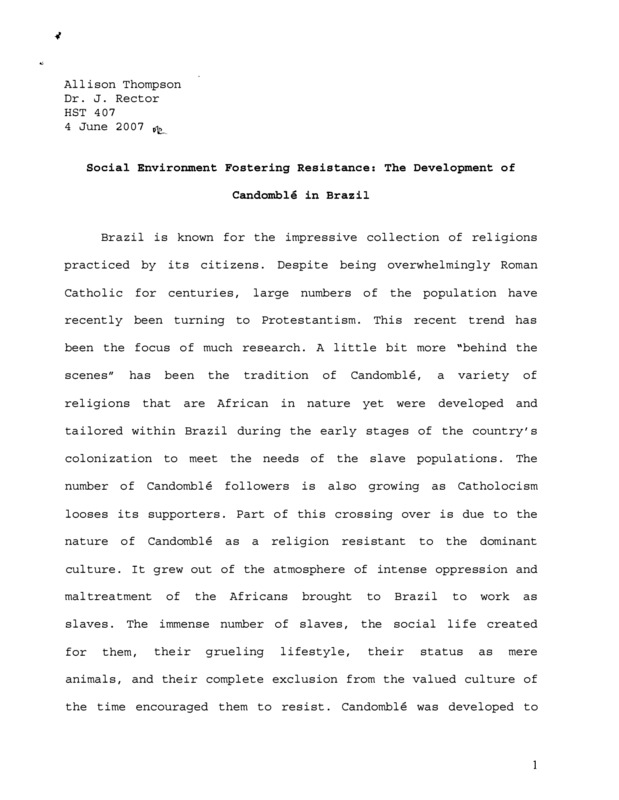 Social Environment Fostering Resistance: The Development of Candomblé in Brazil