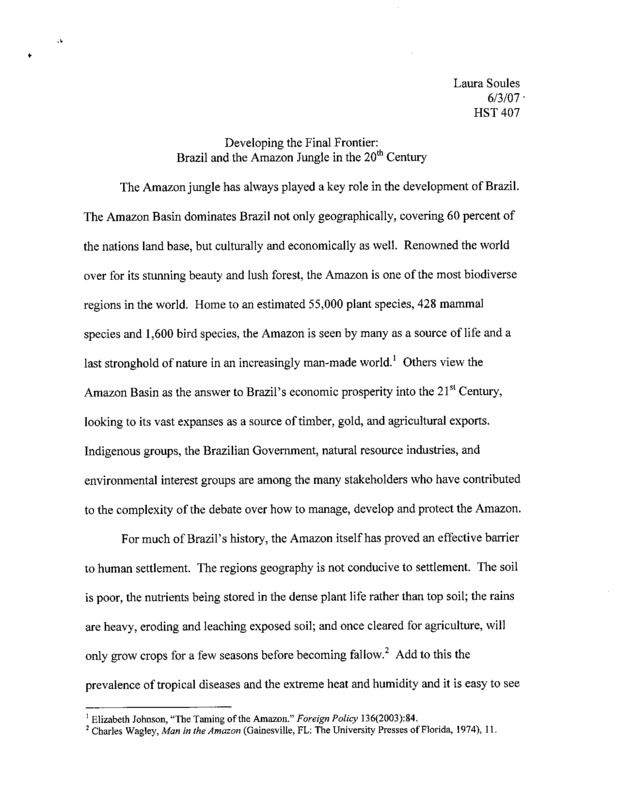 Developing the Final Frontier: Brazil and the Amazon Jungle in the 20th Century