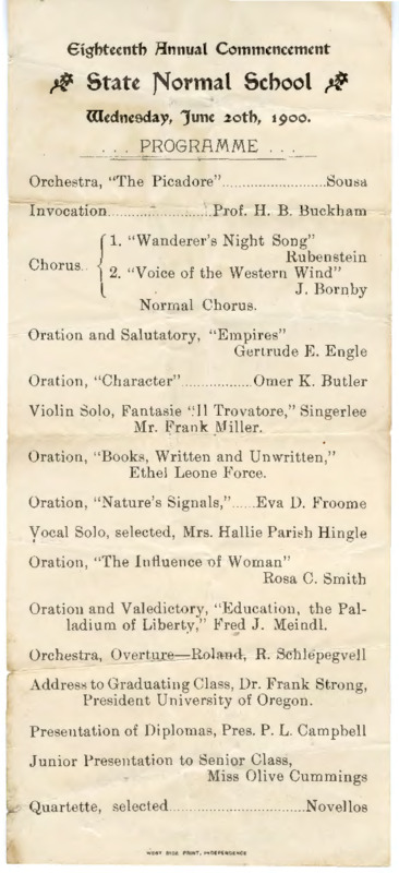 Eighteenth Annual Commencement. [Oregon] State Normal School. Wednesday, June 20th, 1900.