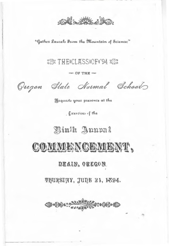 The Class of '94 of the Oregon State Normal School Requests your presence at the exercises of the Ninth Annual Commencement, Drain, Oregon, Thurday, June 21, 1894.