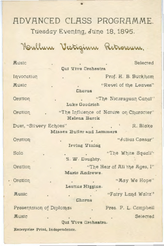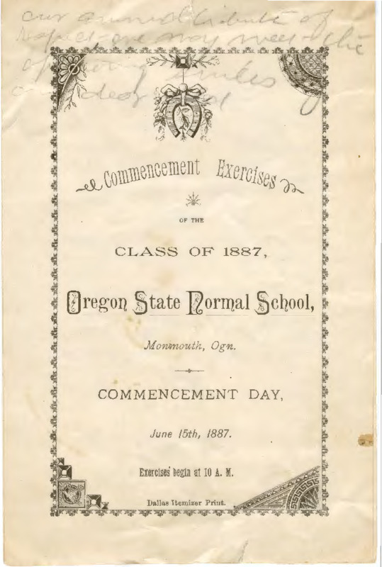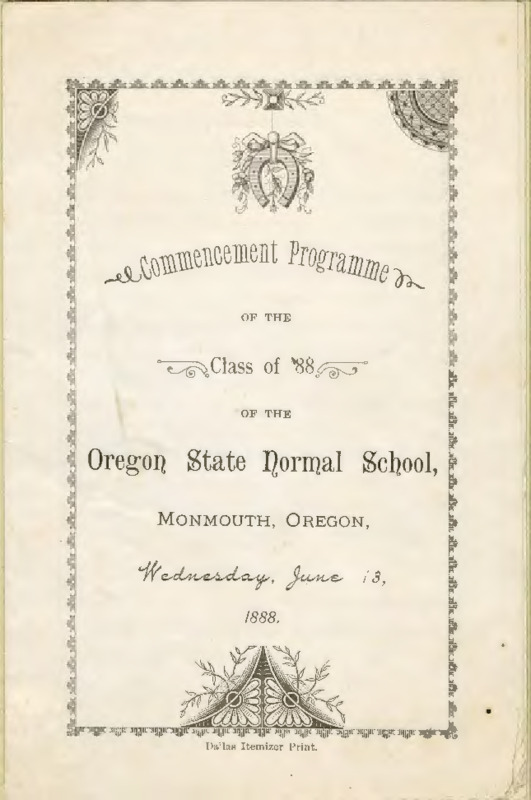 Commencement Exercises of the Class of 1887, Oregon State Normal School, Monmouth, Ogn. Commencement Day, June 15th, 1887.