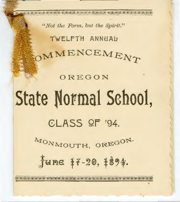 Twelfth Annual Commencement. Oregon State Normal School, Class of '94. Monmouth, Oregon. June 17-20, 1894.