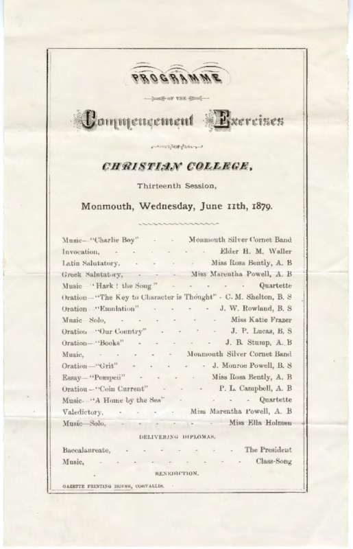 Programme of the Commencement Exercises of Christian College. Thirteenth Session, Monmouth, Wednesday, June 11th, 1879.