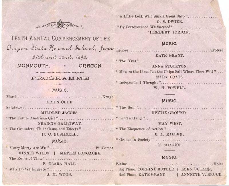 Tenth Annual Commencement of the Oregon State Normal School, June 21st and 22nd, 1892. Monmouth, Oregon.