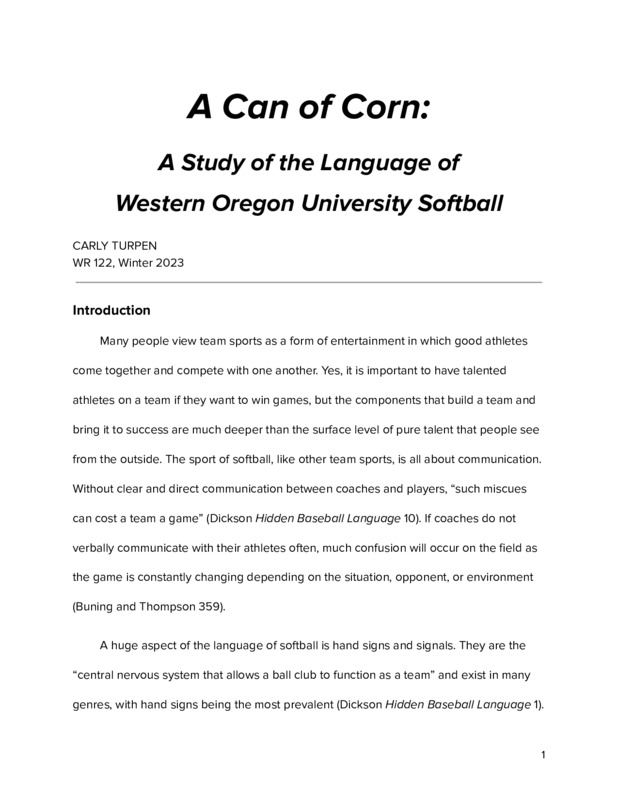 A Can of Corn: A Study of the Language of Western Oregon University Softball